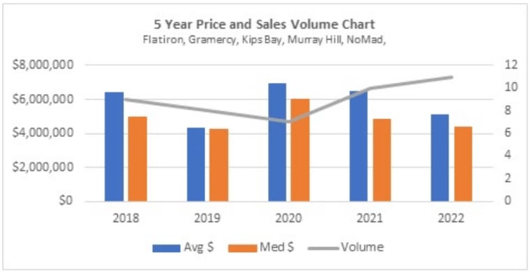 Lower prices and higher sales volume in Kips Bay/NoMad accounted for the overall decrease in price. Over the past 2 years average prices were 70% higher and median prices were almost 45% higher in Flatiron, Gramercy, and Murray Hill than in Kips Bay/NoMad which had more than double the amount of sales volume.